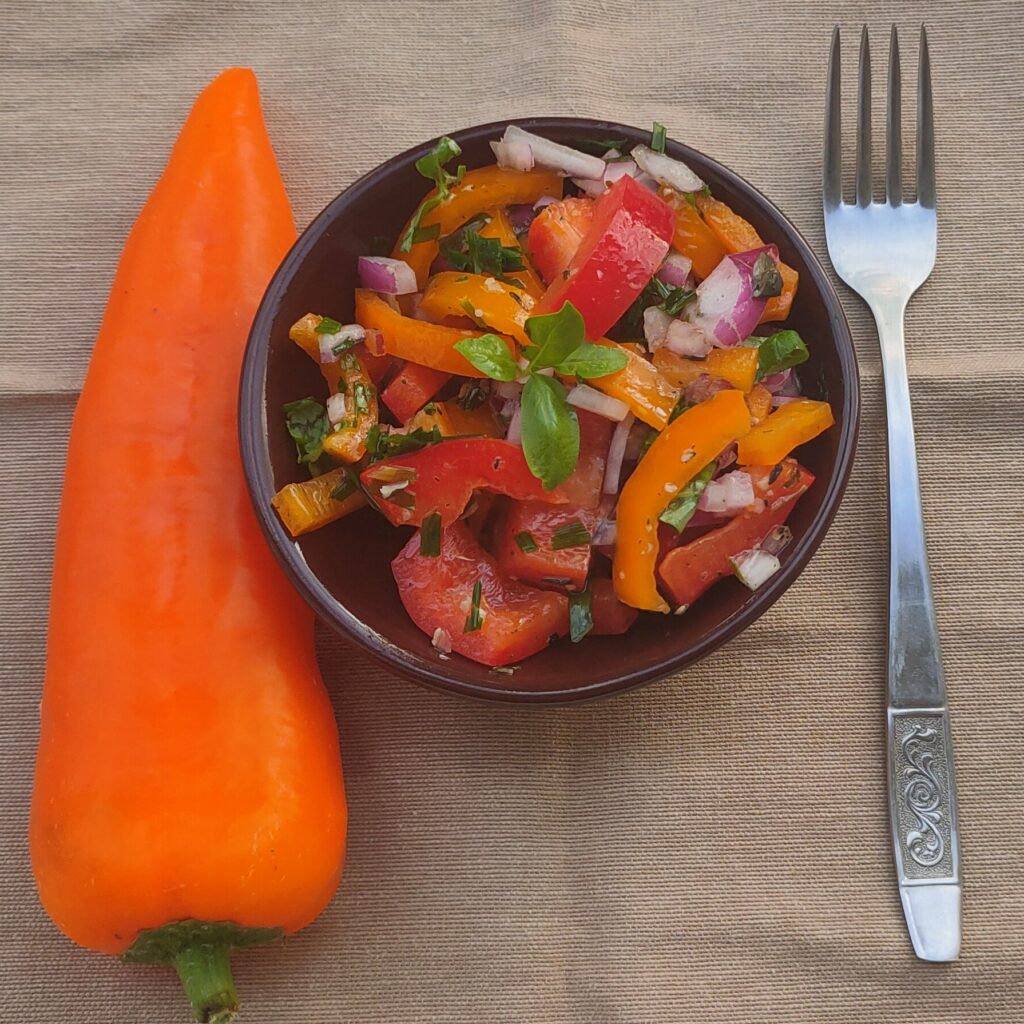 Zeleninu očistíme, papriku pokrájíme na menší proužky, cibulku na půlkolečka. Bylinky a dýňová semínka nasekáme nadrobno. Promícháme kousky papriky, cibulku, dýňová semínka a 2 lžíce oleje, okořeníme pepřem a trochou soli. Necháme asi čtvrt hodiny vychladit. Čerstvé bylinky vmícháme těsně před podáním.