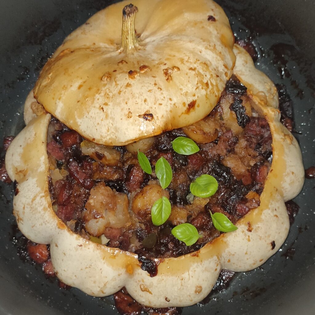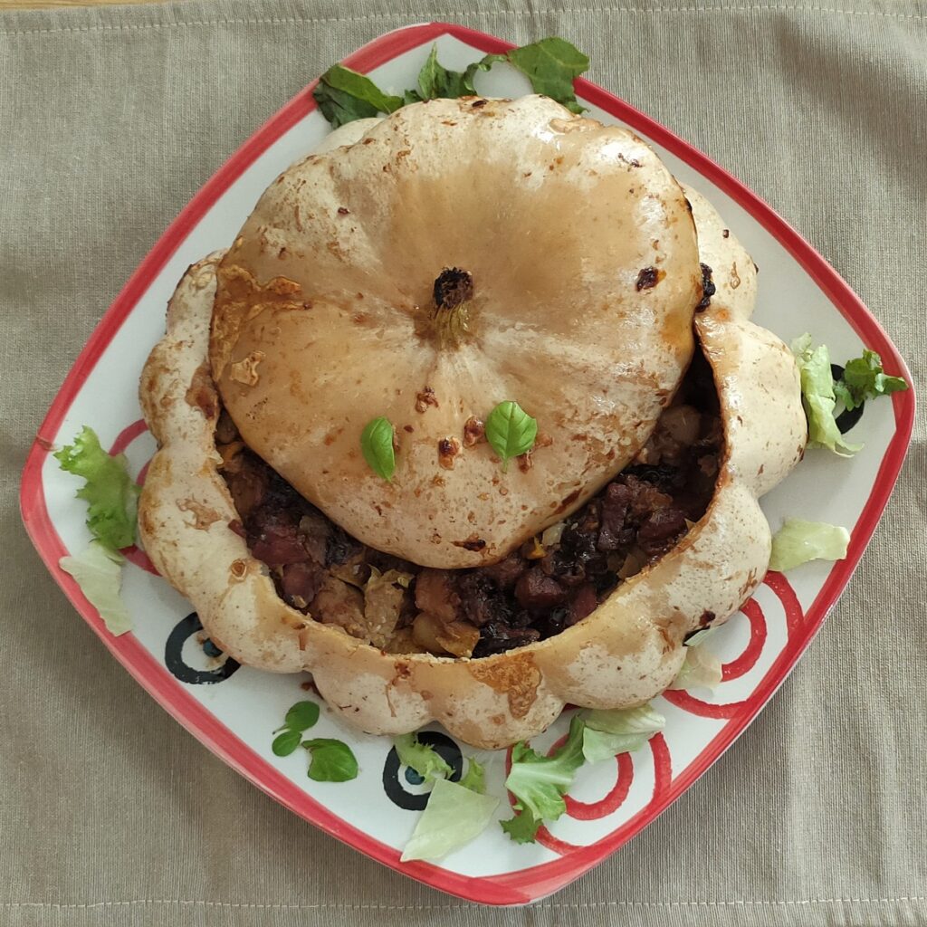 Připravenou směsí naplníme vydlabaný patizonový disk. (Vegetariáni mohou k veganskému základu přidat rozšlehané vajíčko a nastrouhaný parmezán. Sýr se pak ještě přidá na pár minut „bez pokličky“, až bude skoro pečeno.)