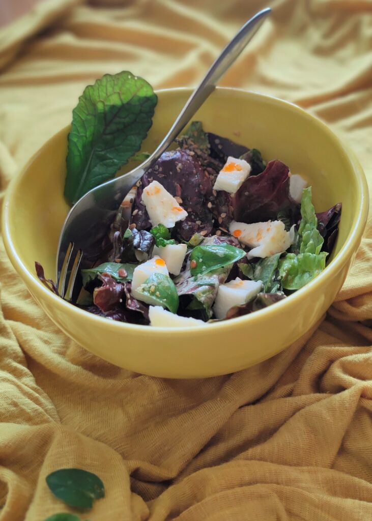 Listové saláty dávají do základu křehkost a chuťovou neutralitu. Tu dodá i sýr Mozzarella. Salát zjemní, ale nechá vyniknout hořčičnou chuť listů a dresingu.