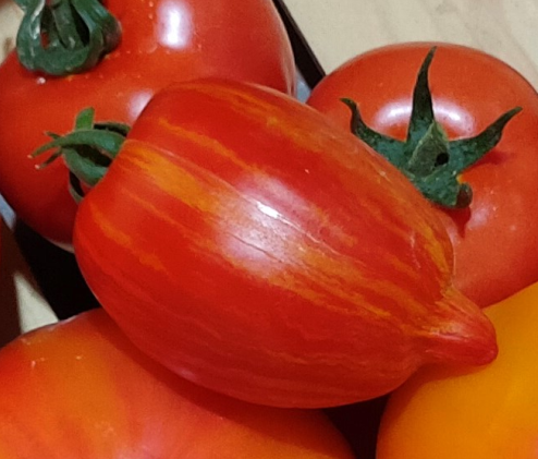 Tento druh má protáhlé zašpičatělé plody jasně červené barvy se žlutým žíháním. Jeví se vyzrálejší než jiné druhy, mají výrazněji červenou dužninu i slupku. Ta bývá, jak už jsme si řekli výše, krásně žíhaná dožluta. Plody mají vynikající aroma. Tato rajčata jsou chutná, šťavnatá a masitá. Zůstávají déle tvrdá a nerozpadají se. Proto se hodí více pro studenou kuchyni, na ozdobu zeleninových mís, chlebíčků a do salátů.