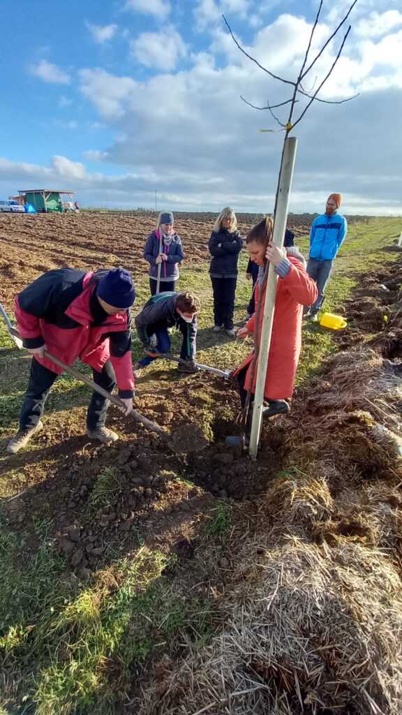 A taky jsme zasadili prvních pár ovocných stromů. Za pár let se můžete těšit na takové lahůdky jako je jablíčko Smiřické vzácné, Althanova renklóda nebo višně z Královny Hortenzie. 🙂