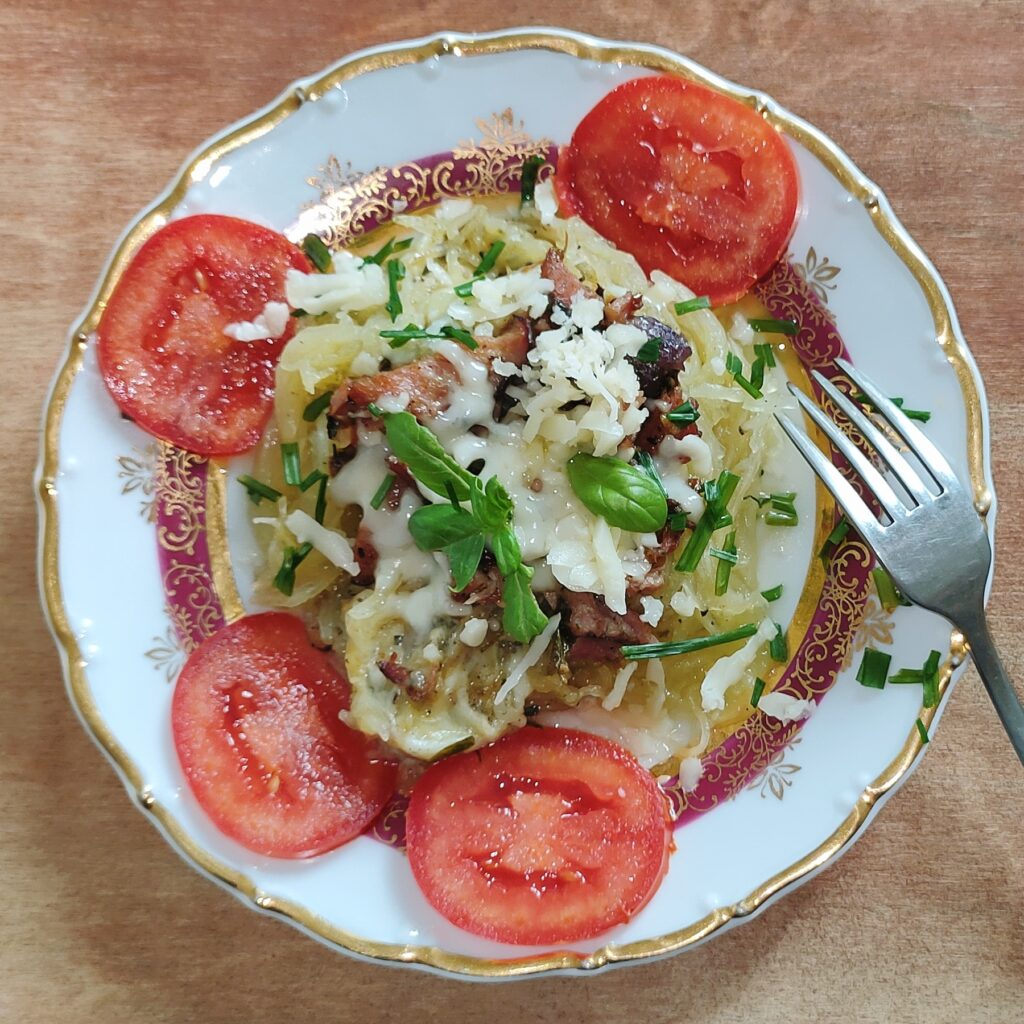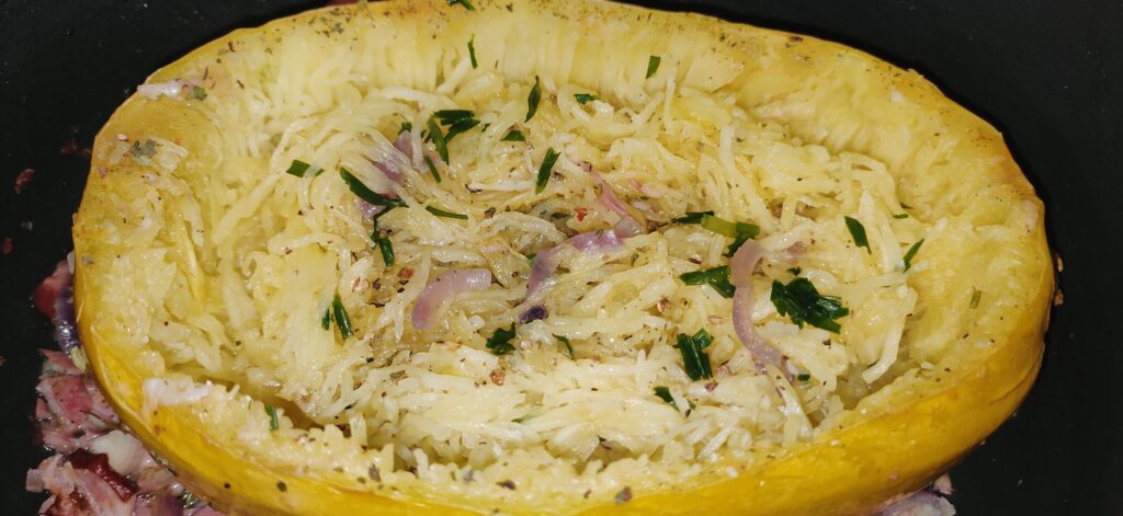 Po dopečení necháme dýni mírně vychladnout a vidličkou naškrábeme pověstné „špagety“. Vyndáme je do pánve a lehce promícháme se směsí. Tou pak zase naplníme dýni, vrátíme na plech, tentokrát řezem nahoru jako lodičku a necháme propéci zhruba 20 minut. (Kolem dýně můžeme poklást ještě cibulku). Na posledních 10 minut posypeme strouhaným parmezánem, aby krásně zezlátla kůrčička.